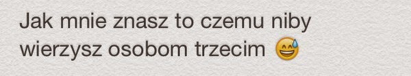 Jestem głupia, ale całkiem inteligentna, potrafię rozwiązywać cudze problemy, ale nie potrafię uporać się ze swoimi. Lubie wiedzieć dużo a temat innych ludzi, chodź ta wiedza nie jestem mi w ogóle do niczego potrzebna. Każdego nowego tygodnia, zaczynam wszystko od nowa, pragnę się zmienić i wierzę, że kiedyś mi się to uda, chodź czasem krytycznie spoglądam na świat, wiem, że sama potrzebuję dużo pracy, poza tym uśmiecham się, żartuję, płaczę i kłamię, jak każdy chodź codziennie obiecuje sobie tego nie robić. Czasem jestem z siebie dumna, lecz częściej po prostu sobą zmęczona. Zwyczajnie. Nienawidzę swojej nadwrażliwości. Nienawidzę gdy mi nic nie wychodzi, nienawidzę swoich wielkich słabości, nienawidzę swojego strachu, czasami nienawidzę żyć.//MIELNICKA